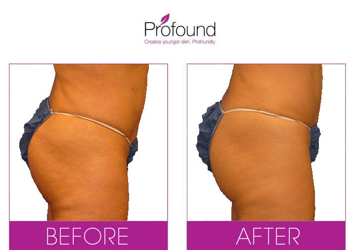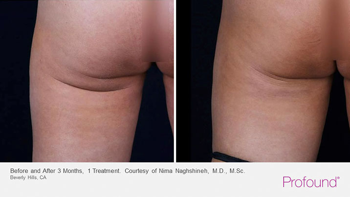 Radiofrequency heat energy triggers the “thermocollagenesis” effect, where the body reaches a certain temperature point to stimulate collagen production. Profound can be used to treat delicate areas around the face and jawline, and can even be used to tighten and tone the buttocks.