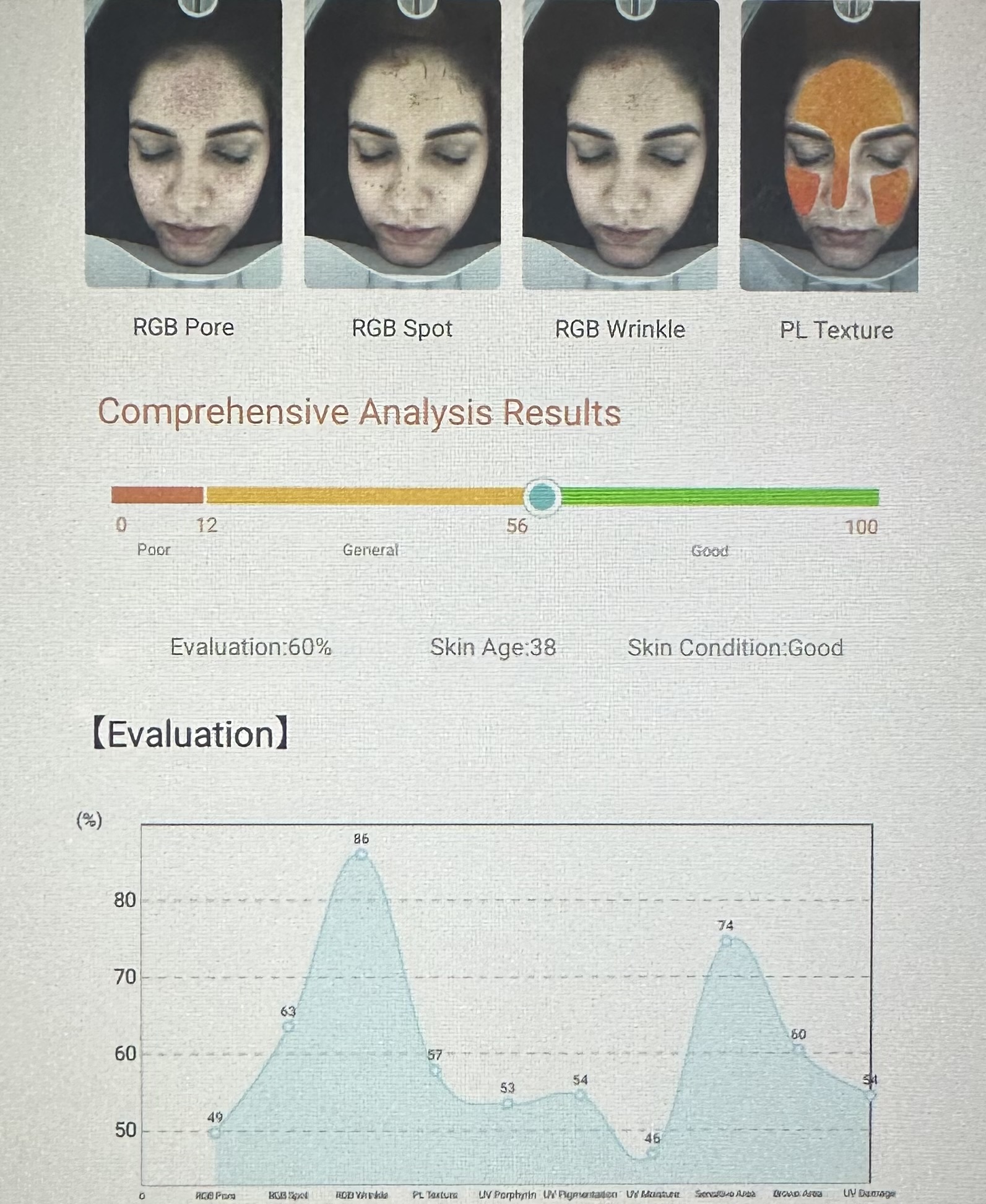 - Detailed Skin Analysis: The machine captures high-resolution images of the skin, allowing for a thorough evaluation of issues like wrinkles, fine lines, pores, brown spots, texture, sun damage, UV moisture, sensitivity ect.